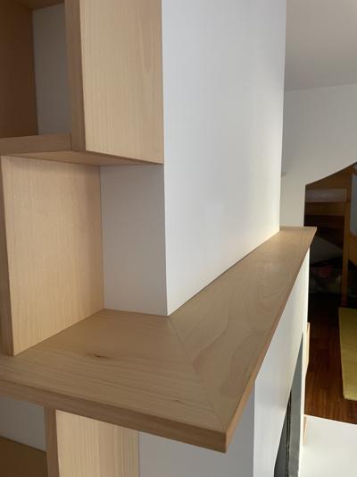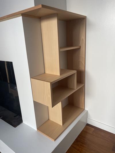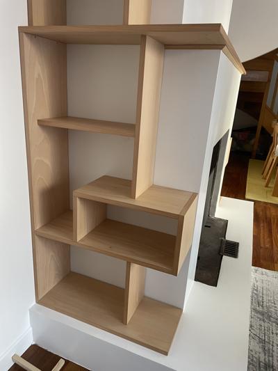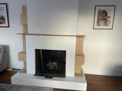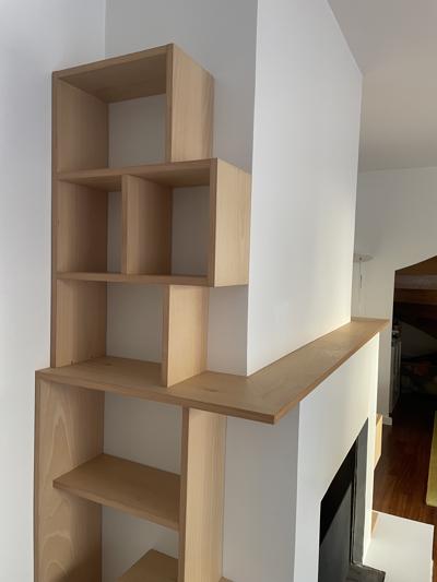Une bibliothèque déstructurée vient habiller cette cheminée toute blanche!