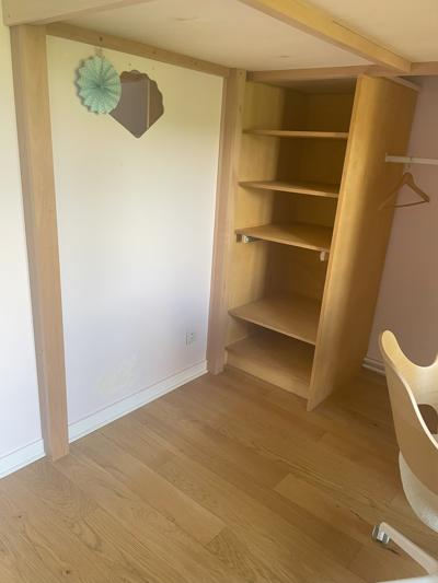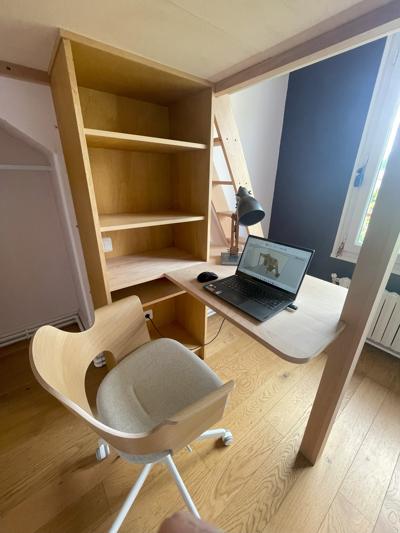Le bureau est orienté face à la fenêtre pour plus de luminosité. Structure et bureau en Hêtre massif, panneaux en contreplaqué de peuplier