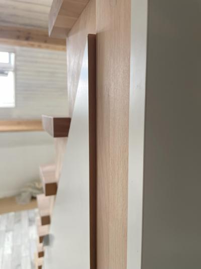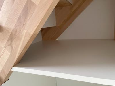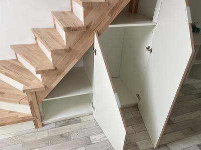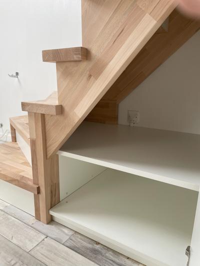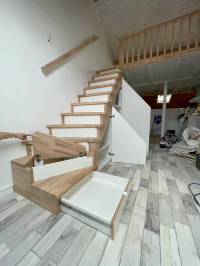 Dans un studio sous les toits, nos clients ont voulu exploiter cette mezzanine à laquelle on accédait par une échelle de meunier. Un joli escalier bicolore, avec des rangements astucieux sous les marches, un dressing, et un bureau!