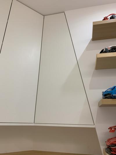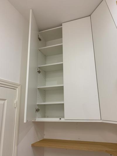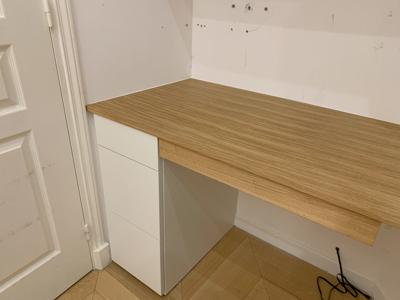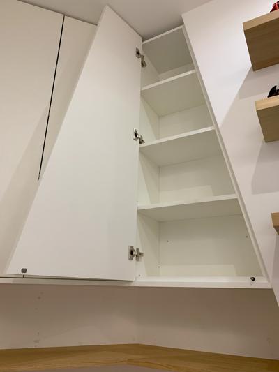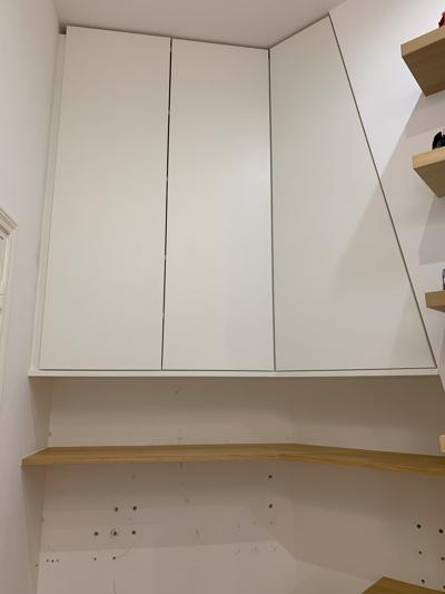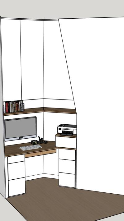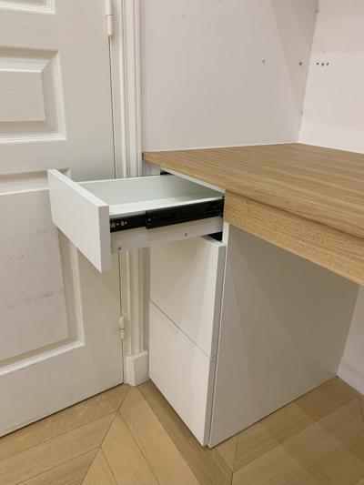 Ce bureau et ces deux meubles suspendus épousent parfaitement les murs, afin d'optimiser les rangements dans cette pièce biscornue, mais qui offre 3m de hauteur sous plafond !Chêne et finition huilée, mélaminé blanc
