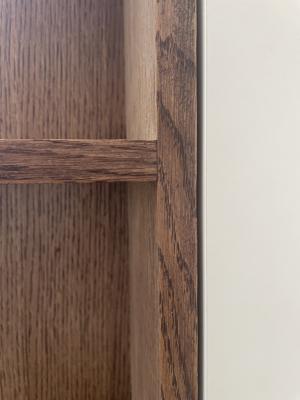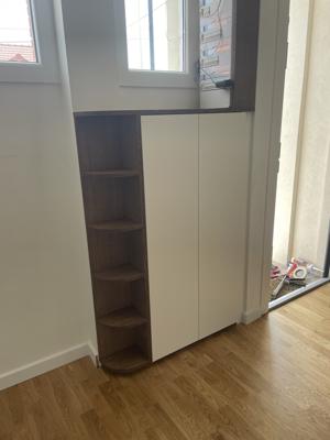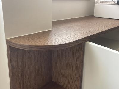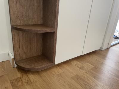 Petit meuble d'entrée sur mesure, bien calé dans un recoin !Chêne et finition huilée teinte chocolat, mélaminé blanc